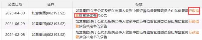 公告未披露具体因何事项导致信披违规,但回溯过往公告,如意集团存在多次被采取行政监管措施的情况。