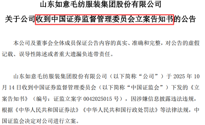 10月14日晚,如意集团发布公告称,于2025年10月14日收到中国证监会下发的《立案告知书》(编号:证监立案字0042025015号),因涉嫌信息披露违法违规,根据《证券法》《行政处罚法》等法律法规,证监会决定对公司进行立案。