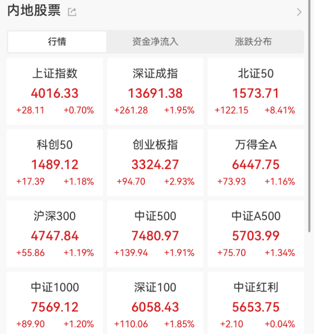 10月29日,A股全天高开高走,沪指再度站上4000点,创业板指涨近3%,北证50指数大涨超8%。截至收盘,沪指涨0.7%,深成指涨1.95%,创业板指涨2.93%。