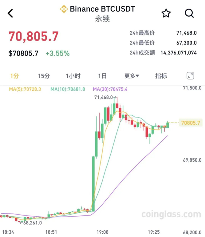 3月23日晚间,比特币突然拉升,日内涨超3%,一度突破7.1万美元/枚。