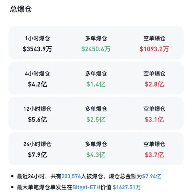 CoinGlass数据显示,过去24小时加密货币市场共有超20万人被爆仓,爆仓总金额为7.94亿美元,其中多单爆仓4.3亿美元,空单爆仓3.7亿美元。