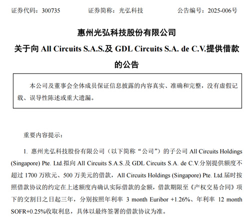 光弘科技公告称,针对上述借款事宜,公司子公司All Circuits Holdings(Singapore)Pte. Ltd.将作为出借人,分别与AC公司、GDL公司作为借款人签署借款协议。