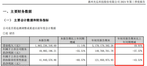 2024年前三季度,光弘科技的营业收入为51.78亿元,同比增长49.91%;归母净利润为1.49亿元,同比下降37.37%。
