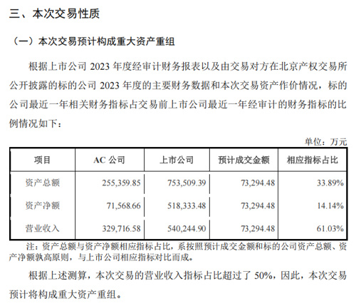 重大资产重组交易预案显示,按照2023年财务数据测算,本次交易的营业收入指标占比超过50%,预计构成重大资产重组。