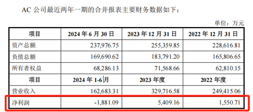 2022年、2023年及2024年上半年,AC公司的净利润分别为1550.71万元、5409.16万元、-1881.09万元。