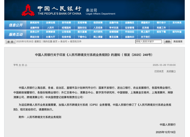12月26日,央行官网发布消息称,为适应跨境人民币业务发展需要,加强人民币跨境支付系统(CIPS)业务管理,中国人民银行修订了《人民币跨境支付系统业务规则》,自2026年2月1日起施行。
