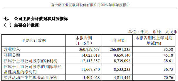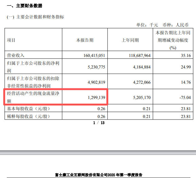 2025年第一季度末、第二季度末,工业富联经营活动产生的现金流量净额分别为12.99亿元、14.07亿元,同比分别下降75.04%、70.76%。