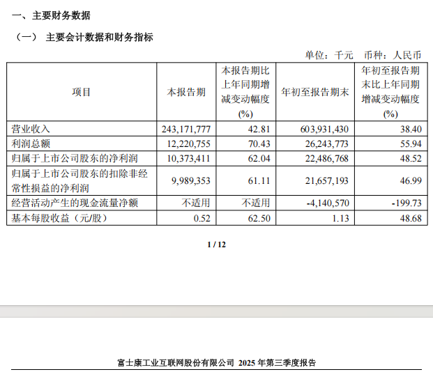 2025年前三季度,工业富联的营业收入为6039.31亿元,同比增长38.40%;归母净利润为224.87亿元,同比增长48.52%;扣非后净利润为216.57亿元,同比增长46.99%。