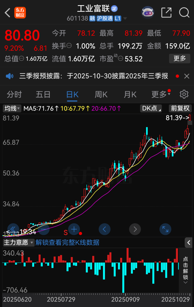 截至10月29日收盘,工业富联股价报80.80元/股,涨幅达9.20%,总市值为1.60万亿元。