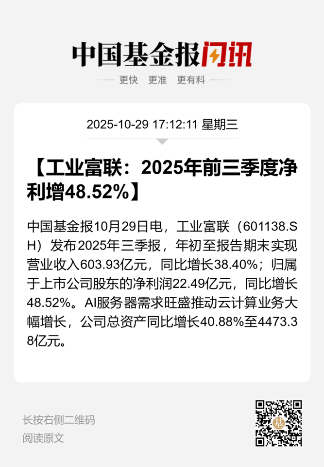 10月29日晚间,工业富联发布2025年三季报称,受益于AI业务强劲增长,公司2025年第三季度的归母净利润首次突破100亿元,达103.73亿元,同比增长62.04%。