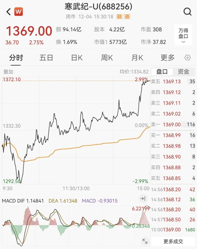 截至收盘,寒武纪报1369元/股,总市值为5773亿元。今年以来,寒武纪股价累计涨幅达108%。