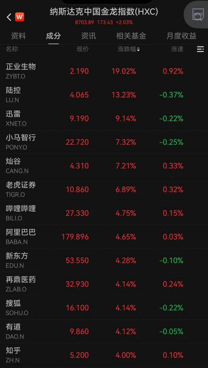 热门中概股多数收涨,纳斯达克中国金龙指数上涨2.03%。