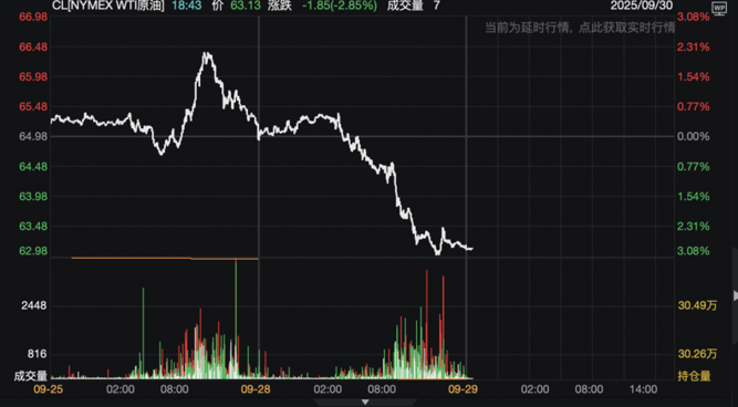 国际原油价格跳水,截至发稿,NYMEX WTI原油下跌2.85%。