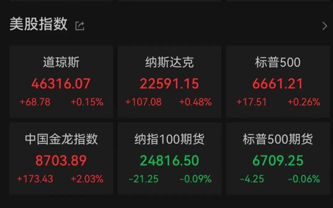 截至收盘,道琼斯指数上涨0.15%,报收于46316.07点;标普500指数上涨0.26%,报收于6661.21点;纳斯达克综合指数上涨0.48%,报收于22591.15点。