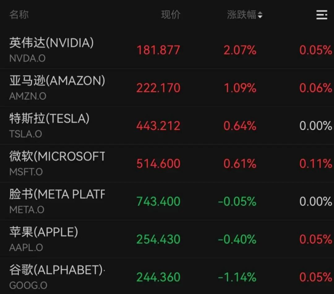 大型科技股涨跌不一,英伟达上涨2.07%,亚马逊上涨1.09%。谷歌下跌1.14%,苹果下跌0.40%。