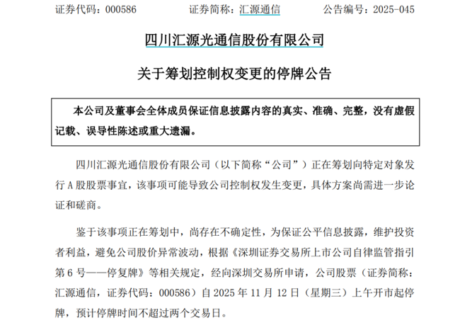 11月11日,汇源通信发布公告称,正在筹划向特定对象发行A股股票事宜,该事项可能导致公司控制权发生变更。经申请,公司股票自11月12日(星期三)上午开市起停牌。