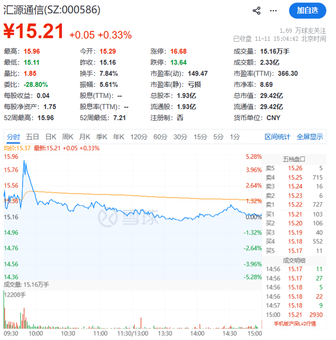 截至11月11日收盘,汇源通信股价报15.21元/股,总市值为29.42亿元。