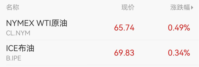 原油方面,截至当天收盘,纽约商品交易所WTI原油期货当月连续合约上涨0.32美元,收于每桶65.74美元,涨幅为0.49%。