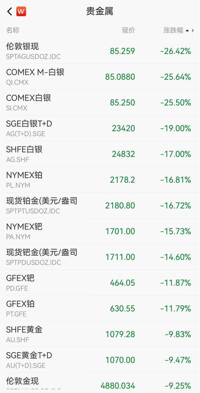 先看贵金属收盘数据:现货白银盘中最高暴跌至36%,最后报收85.259美元/盎司,日跌26.42%,跌回到1月13日左右价格。