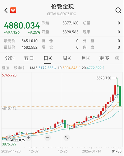 现货黄金盘中最高跌超12%,最低跌破4700美元/盎司,最终报收4880.034美元/盎司,日跌9.25%,跌回1月22日左右价格。
