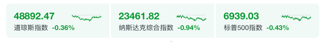 截至收盘,道琼斯工业平均指数跌0.36%,报48892.47点;标普500指数跌0.43%,报6939.03点;纳斯达克综合指数跌0.94%,报23461.82点。