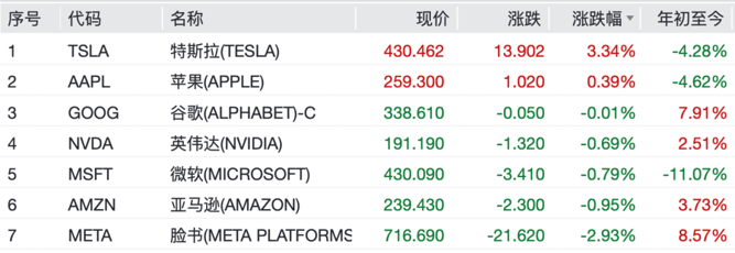 个股方面,特斯拉大涨3%,苹果上涨;META跌近3%,亚马逊、微软、英伟达等下跌,AMD跌超6%,英特尔跌超4%。