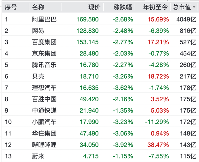 中概股多数下跌,纳斯达克中国金龙指数跌2.36%,1月份累涨2.69%。热门中概股方面,阿里巴巴跌2.68%,贝壳、理想汽车、小鹏汽车跌超3%,网易、百度集团、京东集团、腾讯音乐跌超2%。