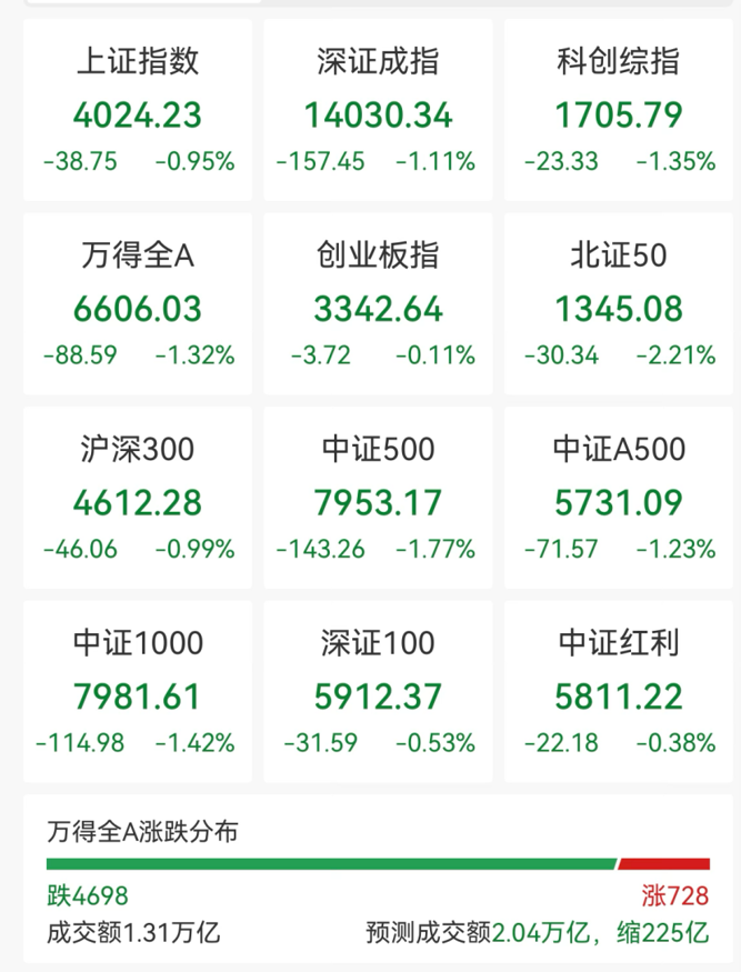 沪深两市半日成交额为1.31万亿元,较上个交易日缩量225亿元。全市场728只个股上涨,32只个股涨停,4698只个股下跌。