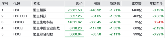港股市场跌幅明显,截至发稿,恒生指数跌1.71%,恒生科技指数跌1.59%,恒生生物科技指数跌2.46%。个股方面,腾讯控股跌超6%,快手跌超5%,哔哩哔哩跌超4%,阿里巴巴跌超3%。