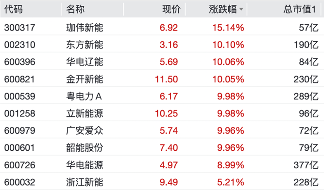 东方新能、华电辽能、金开新能、粤电力A、立新能源、广安爱众、韶能股份纷纷涨停。珈伟新能涨超15%,华电能源涨近9%,长江电力、华电新能、中国广核、华能水电等飘红。