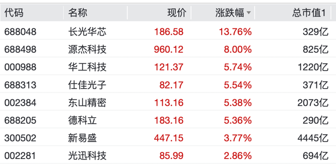 长光华芯大涨超13%,源杰科技涨8%,华工科技、东山精密、德科立均涨超5%。