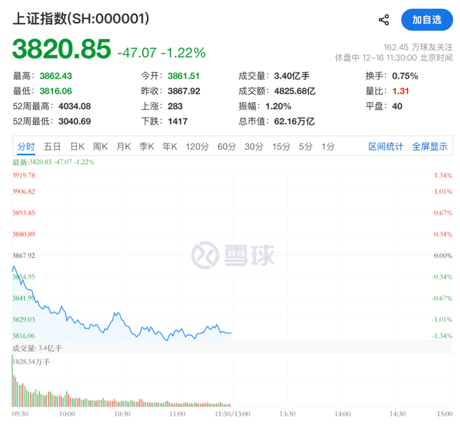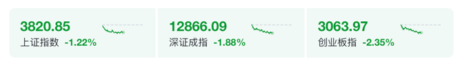 12月16日上午,A股三大股指集体下跌,创业板指、科创50指数均跌超2%。截至午间收盘,沪指回落至3820.85点,跌1.22%,深证成指跌1.88%,创业板指跌2.35%。
