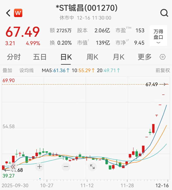 12月16日上午,*ST铖昌再次涨停,现报67.49元/股,走出8日7板。