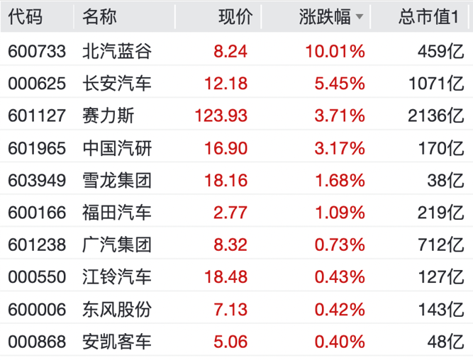 另外,长安汽车涨超5%,上汽集团、长城汽车、广汽集团、福田汽车、安凯客车、东风股份等纷纷上涨。