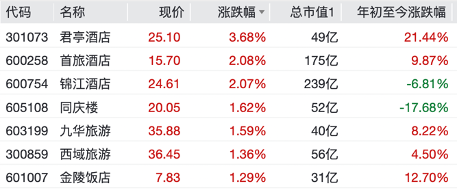 同时,旅游酒店板块走强。其中,君亭酒店一度涨近7%,西安饮食、首旅酒店、西域旅游、同庆楼、曲江文旅、九华旅游、锦江酒店等跟涨。