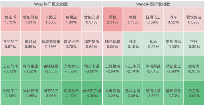 从板块来看,智能驾驶板块爆发,汽车整车股普涨,商业百货、酒店旅游等消费板块持续走高,教育板块涨幅居前;此前上涨幅度较大的大科技板块下挫,贵金属、通信设备、化工等领跌。