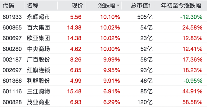 上午,消费板块持续拉升,餐饮旅游、商业百货等板块冲高,多只个股涨停。其中,永辉超市、百大集团、欧亚集团、中央商场、广百股份、红旗连锁、利群股份均录得10cm涨停。