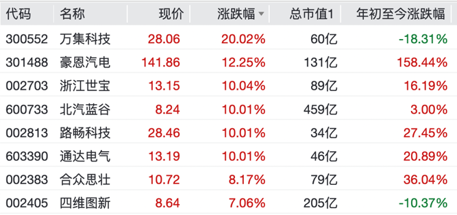 多只概念股涨停。其中,万集科技录得20cm涨停,北汽蓝谷、浙江世宝、路畅科技、索菱股份、通达电气等均录得10cm涨停,赛力斯涨超3%。