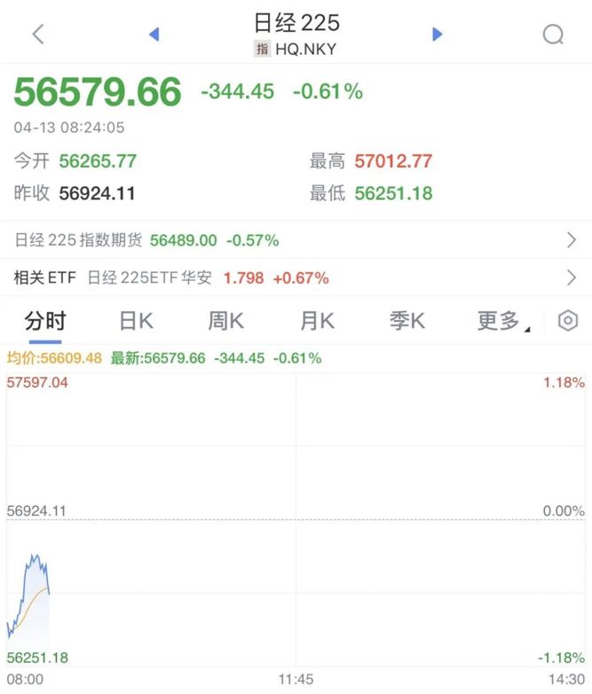 日经225指数一度跌超1%,随后震荡调整,最新报56579.66点。