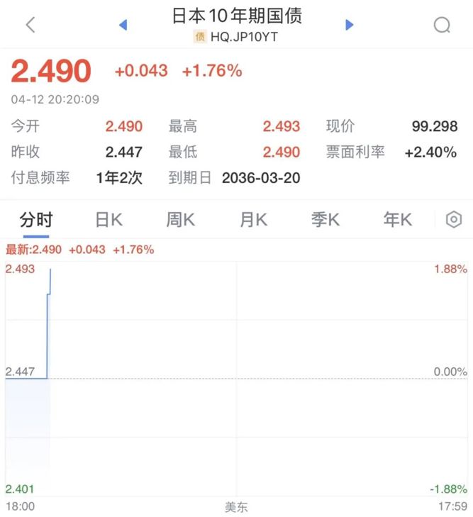 此外,日本10年期国债收益率攀升至1997年以来的最高水准,该基准利率上涨至2.49%。