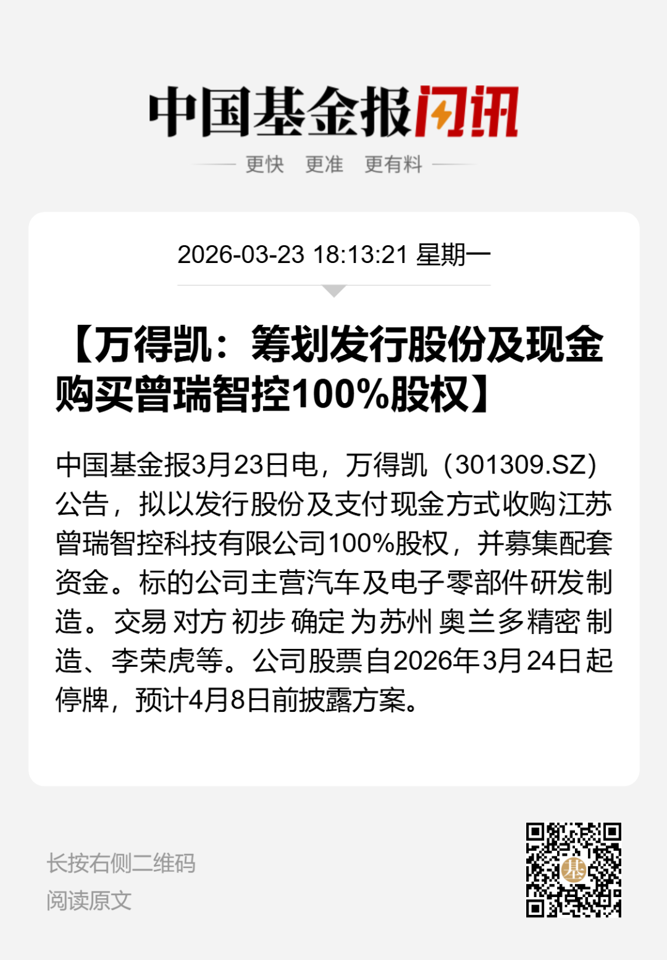 3月23日晚间,万得凯发布公告称,公司正在筹划以发行股份及支付现金的方式,购买江苏曾瑞智控科技有限公司(以下简称曾瑞智控)100%的股权,同时拟募集配套资金。