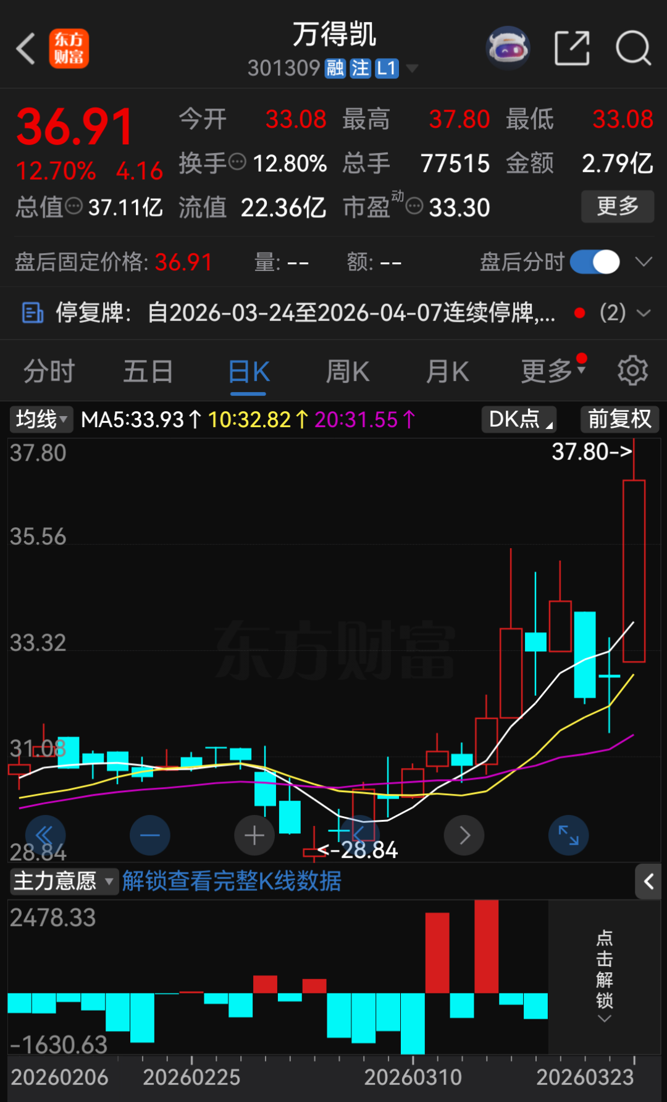 3月23日收盘,万得凯股价报36.91元/股,涨幅达12.70%,总市值为37.11亿元。