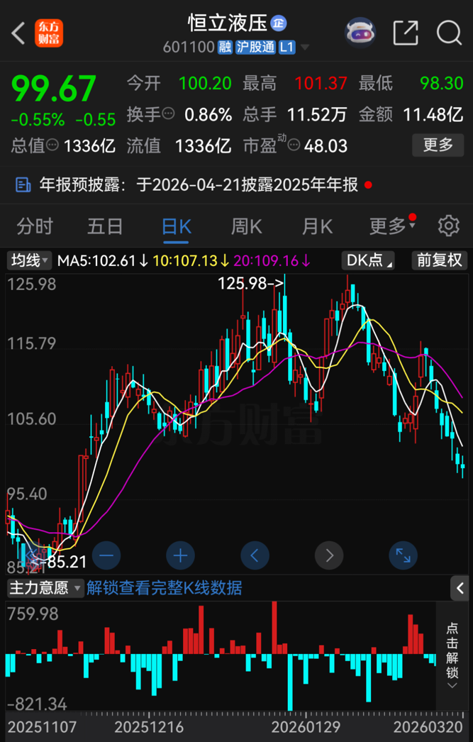 截至3月20日收盘,恒立液压股价报99.67元/股,跌幅达0.55%,总市值为1336亿元。