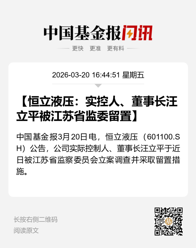 3月20日,恒立液压发布公告称,公司实际控制人、董事长汪立平已被留置。