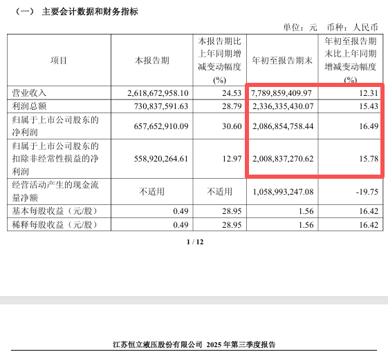 2025年前三季度,恒立液压的营业收入为77.90亿元,同比增长12.31%;归母净利润为20.87亿元,同比增长16.49%。