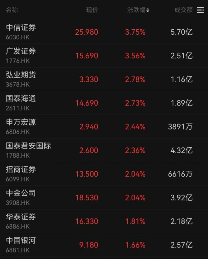 中资券商股中,中信证券、广发证券涨超3%,国泰海通、申万宏源、国泰君安国际、招商证券、中金公司涨超2%。