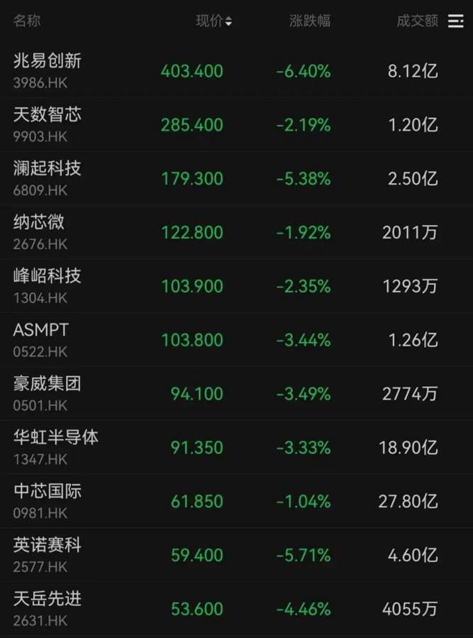 大型科网股、半导体股跌幅较大
