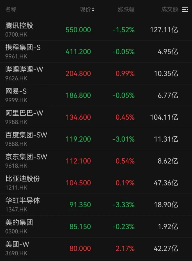 百度跌超3%,腾讯控股、网易、携程等均收跌。