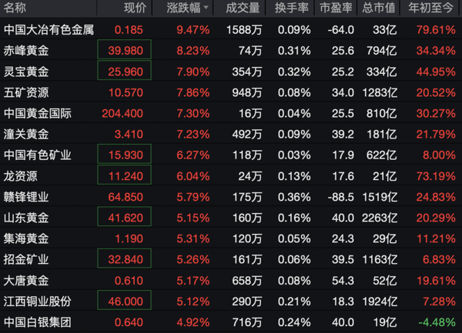 有色金属概念股走强,赤峰黄金、灵宝黄金、五矿资源、中国黄金国际等均涨超7%,赣锋锂业、山东黄金、招金矿业等跟涨。