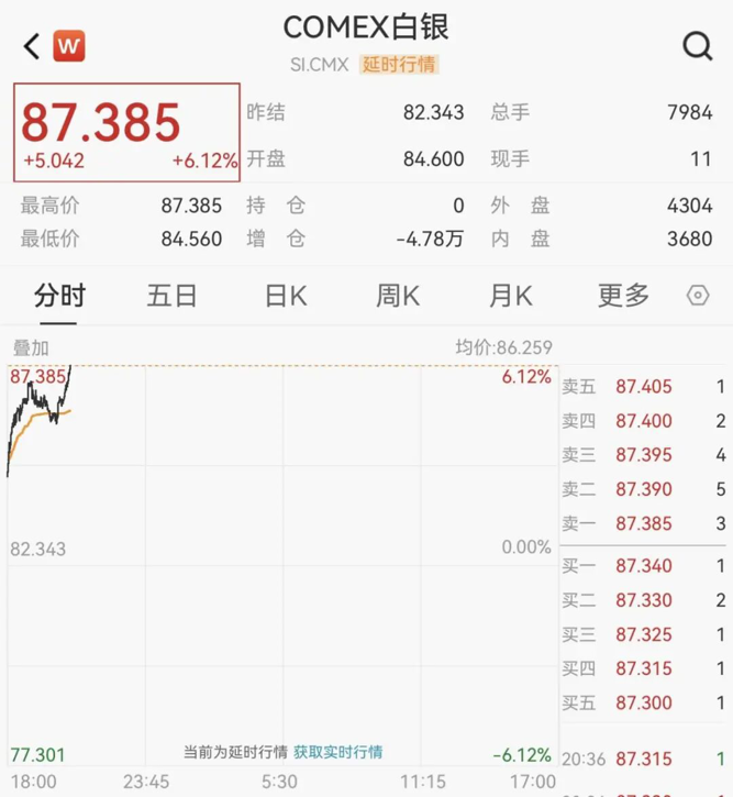 消息面上,金银现货和期货价格大涨,纽约期银日内暴涨6%,现报87.39美元/盎司。
